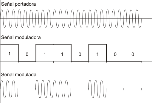 Es una modulación de amplitud donde la señal moduladora (datos) es digital. Los dos valores binarios (0 y 1) se representan con dos amplitudes diferentes y es usual que una de las dos amplitudes sea cero; es decir uno de los dígitos binarios se representa mediante la presencia de la portadora a amplitud constante, y el otro dígito se representa mediante la ausencia de la señal portadora, en este caso la frecuencia y la fase se mantiene constante.